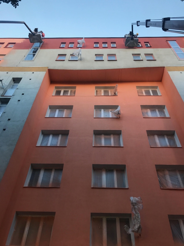 1900 m2 - za 4 dny jsme zvládli olepení oken, mytí fasády, penetraci fasády, drobné opravy a dva nástřiky fasádní barvy.